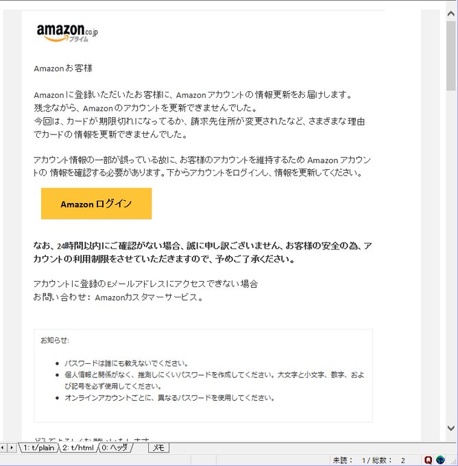 騙されないで!! 騙されそうなメールが届いたので、メール内容をお見せします。1枚目は騙されそうなモノ表示ですが、右側にカーソルがあるのに注目。そのカーソルを下げると2枚目写真の怪しげな感じの羅列が現れます。 pic.twitter.com/VFYw9XFw4b